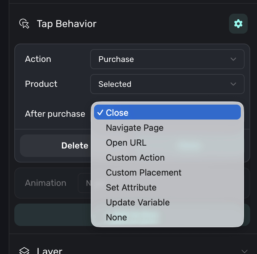 The Navigate Page option is particularly useful in flows. Instead of closing after purchase, the user moves to the next connected page. This opens up use cases like: