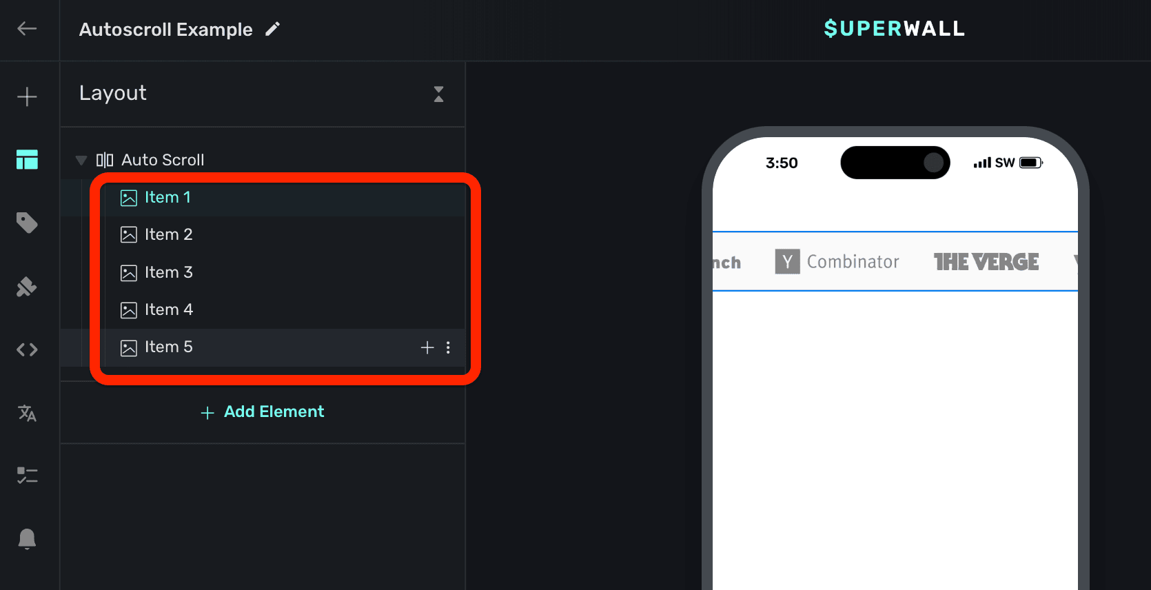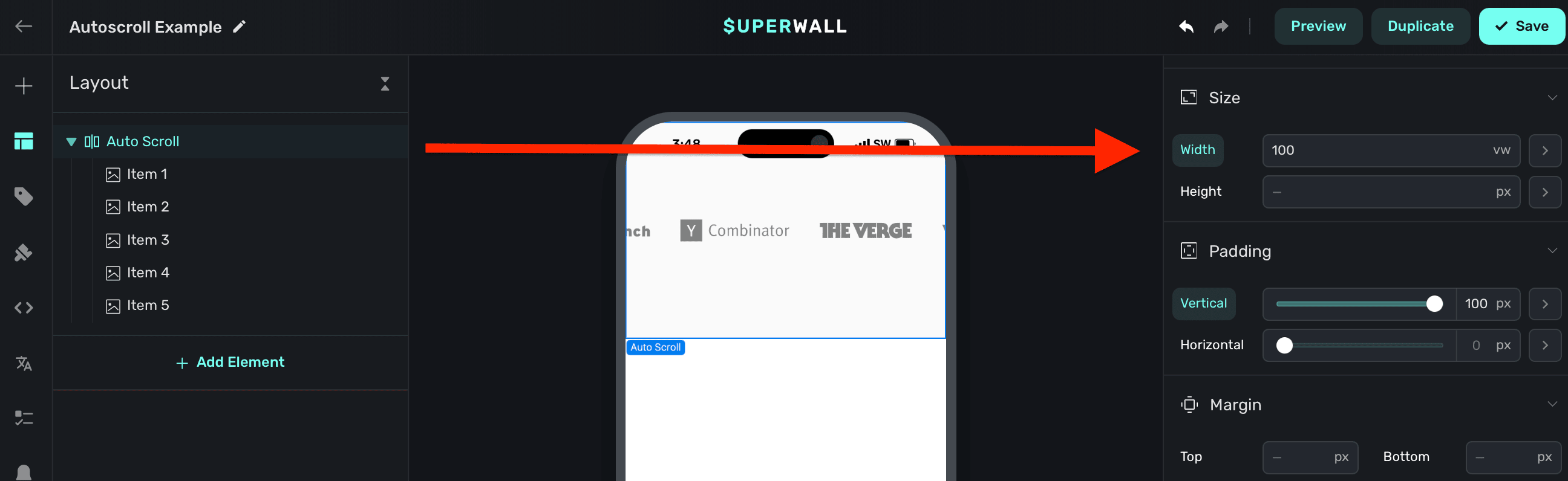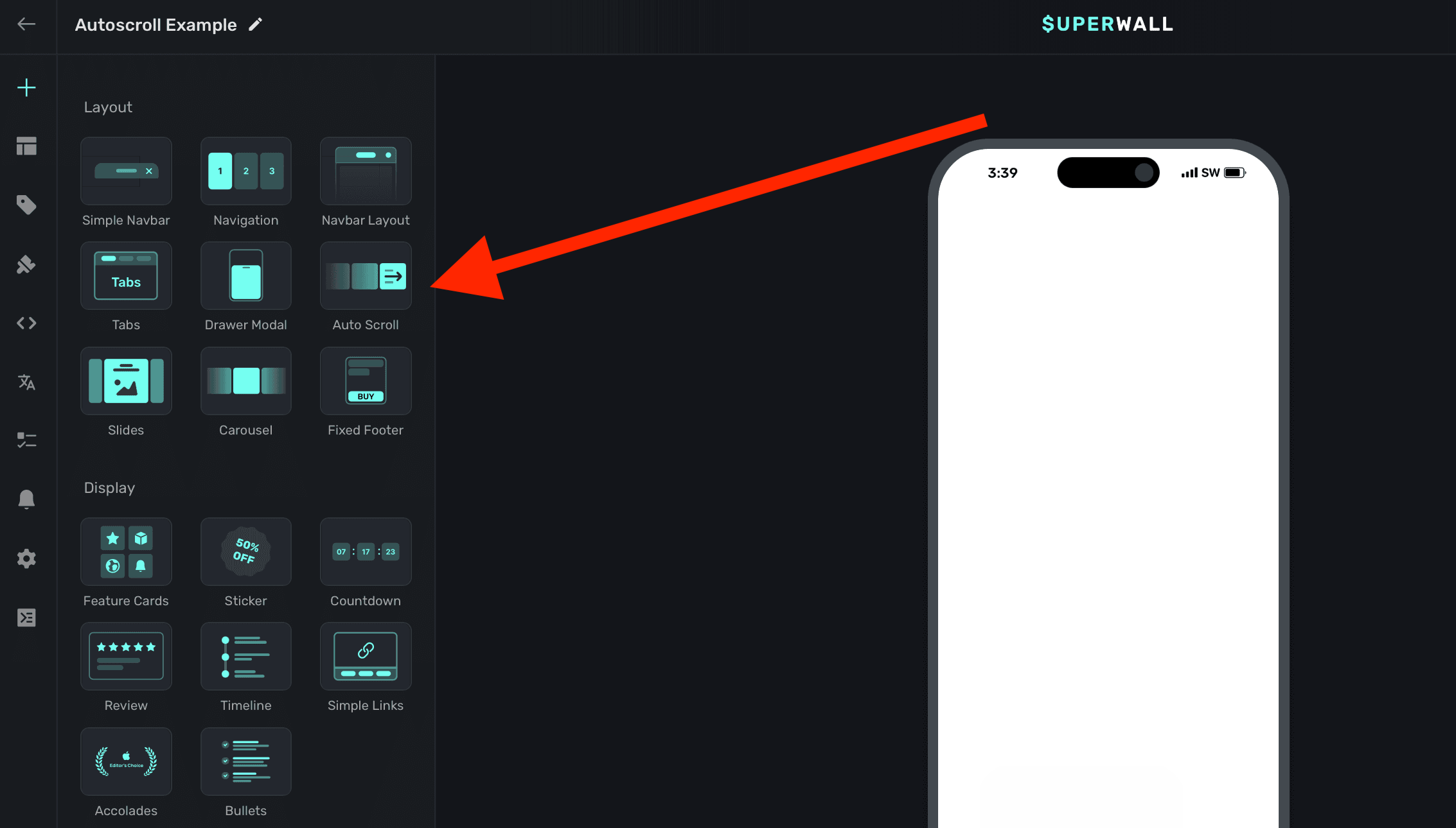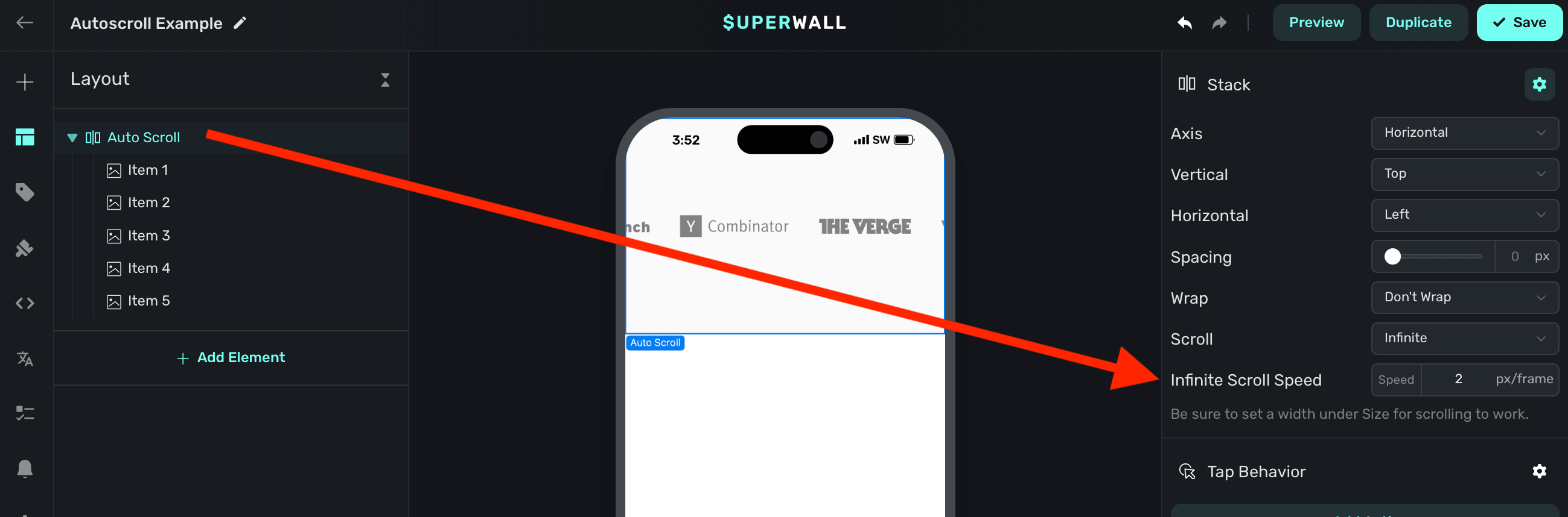 Use Superwall's autoscroll component to create marquee-like content that automatically scrolls.