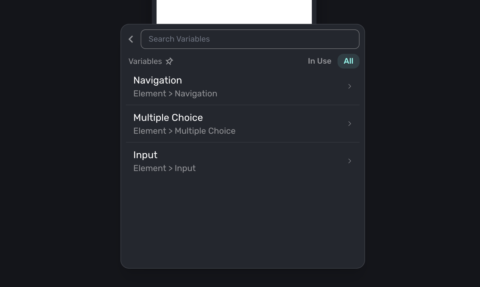 The text users enter can be stored as a user attribute, used as a variable, dynamic values, and more. Any multiple choice item is available as a variable. You can view variables either from the left side variables menu, or via the floating toolbar. Either case, it's exposed via Element -> Input.