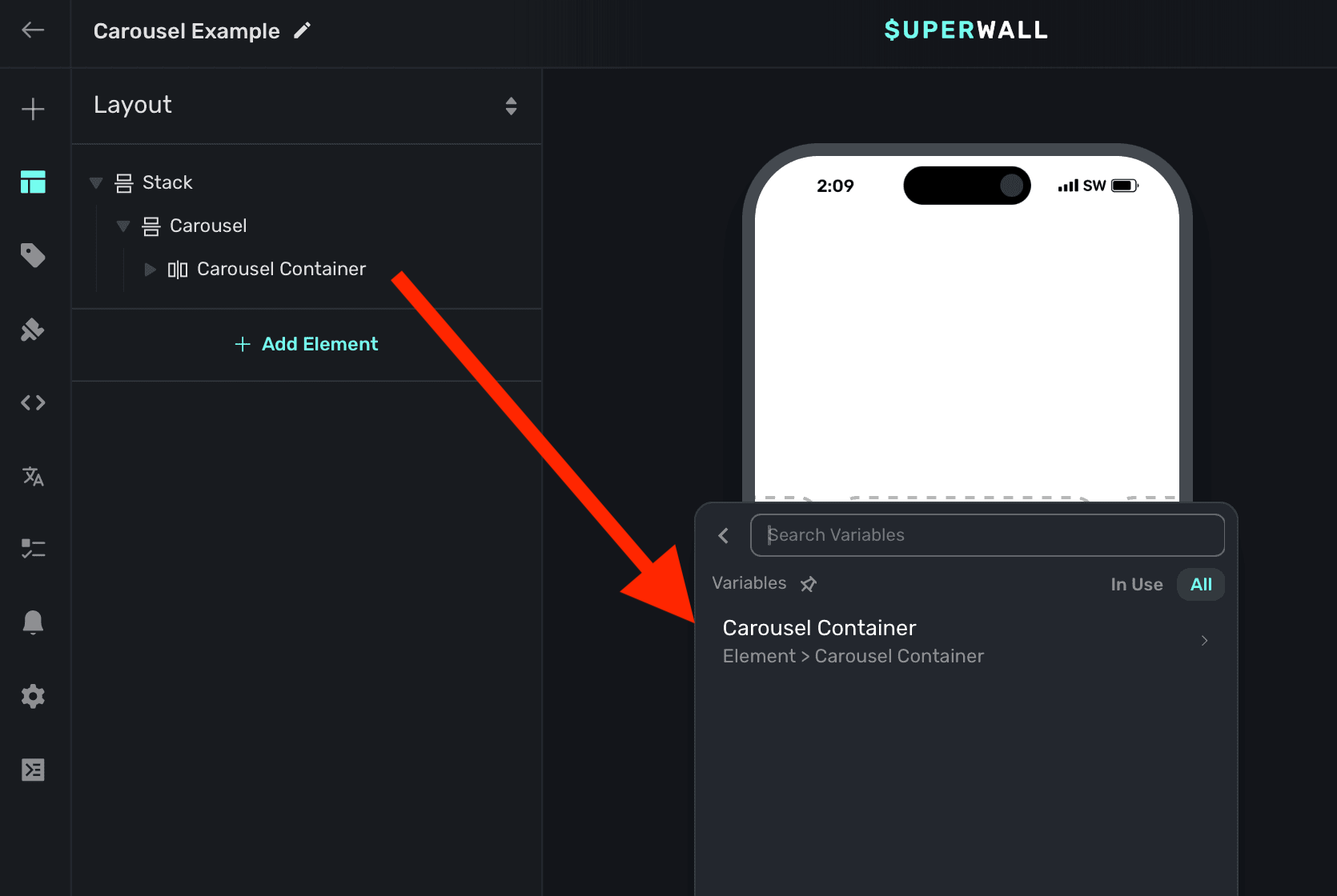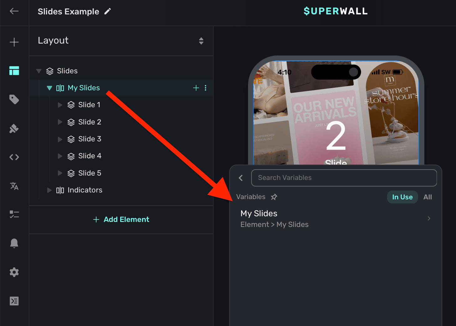 When a slides element is added, Superwall automatically creates an element variable for it (accessed through the Variables tab in the left sidebar, or the variables button in the floating toolbar). Its name will match whatever is in the element hierarchy in the left sidebar: