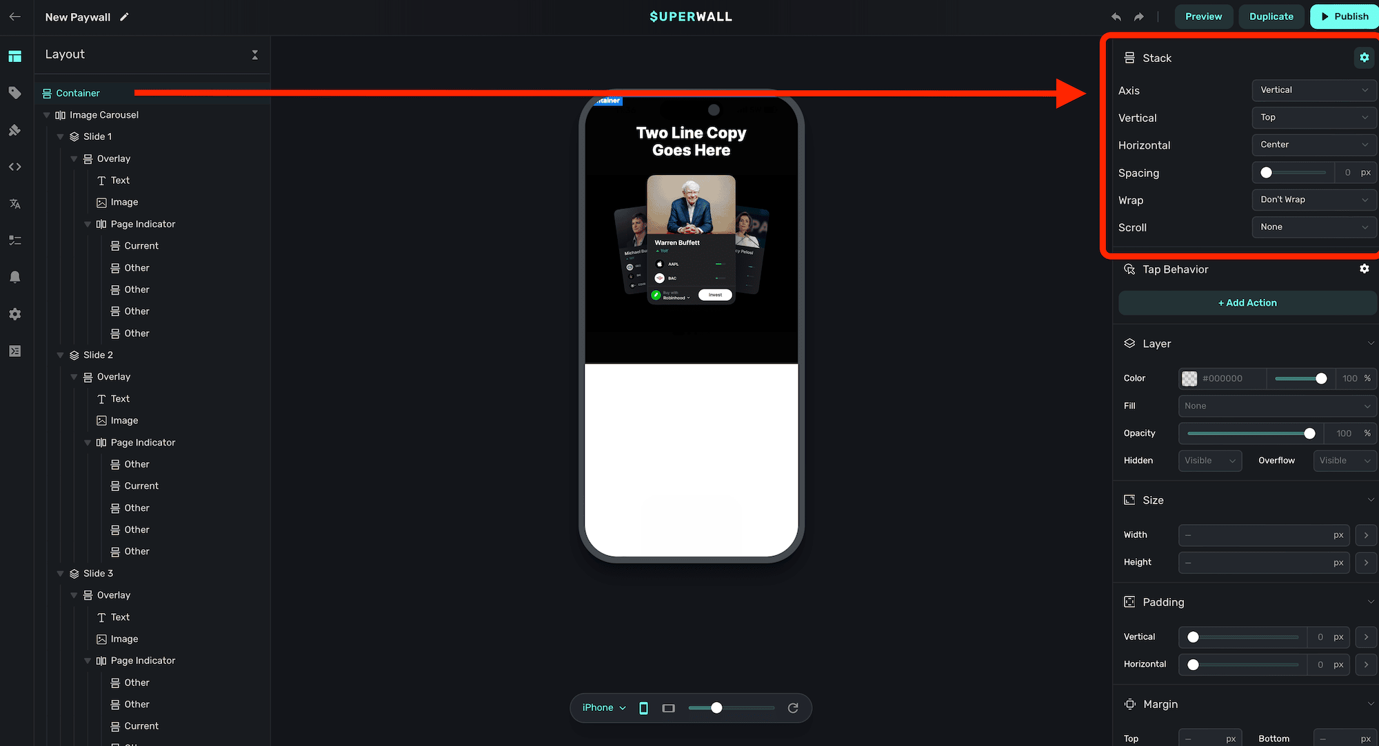 Spacing: Defines the amount of space between items within the stack, measured in pixels by default.