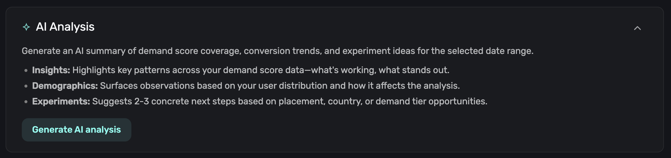 The AI analysis is a great starting point for deciding what experiments to run. See Using Demand Score in Campaigns for how to act on these recommendations.