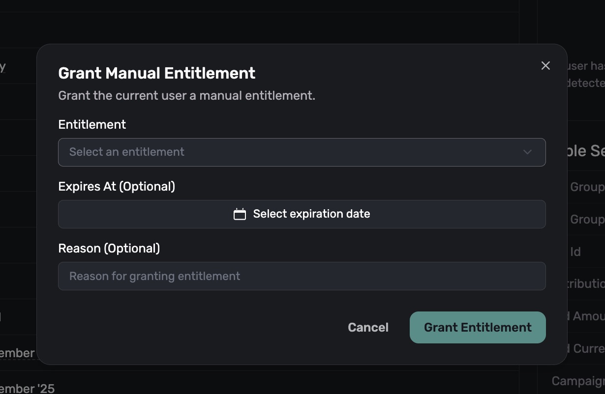 You can manually grant a user any entitlement your app offers. This is useful for activating pro features for someone, handling support issues, and more.