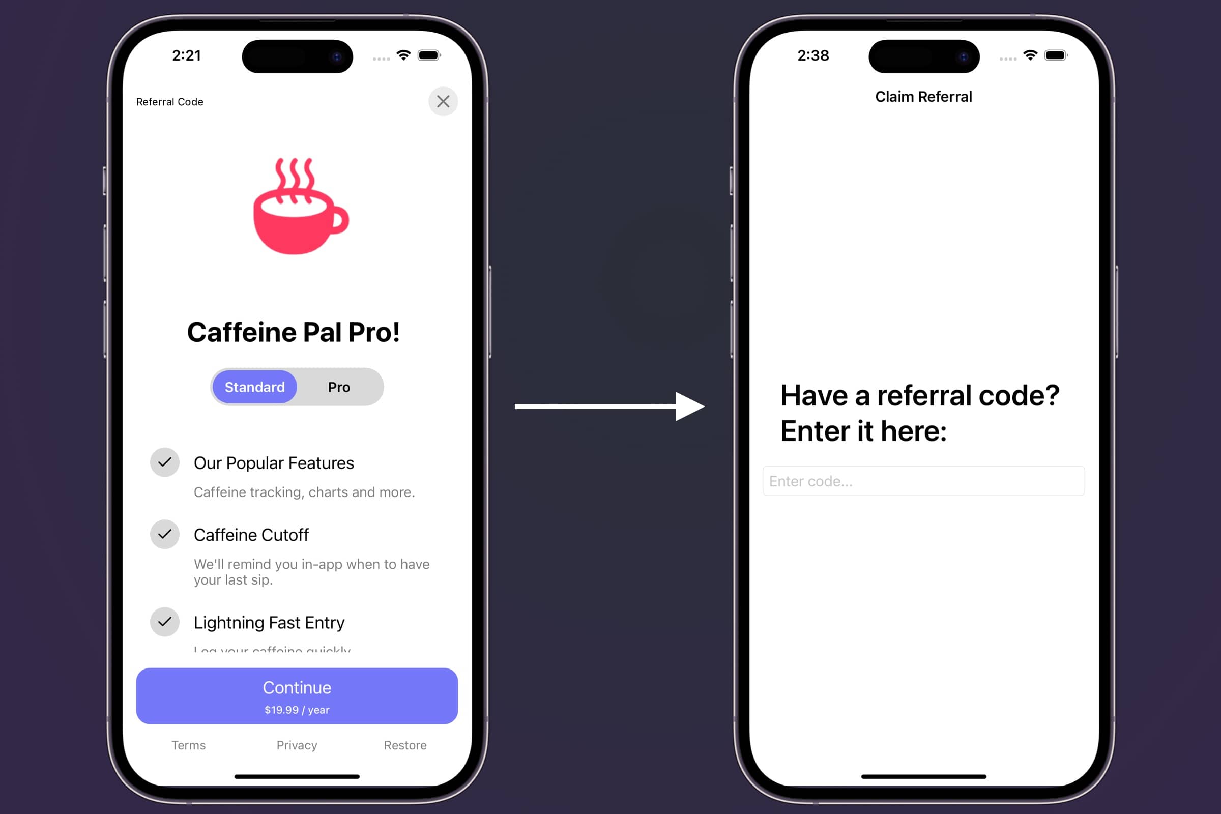1. Using Superwall's Mobile SDKs: By using custom actions along with a campaign for referrals, you can create a flow to handle referral codes and see their resulting conversions and other data. You create the products that each referral should unlock within the respective app storefront.